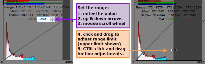 For more control, there are several methods for making adjustments to the selected range of the contrast enhancement. The example below shows each method, followed by a description.
